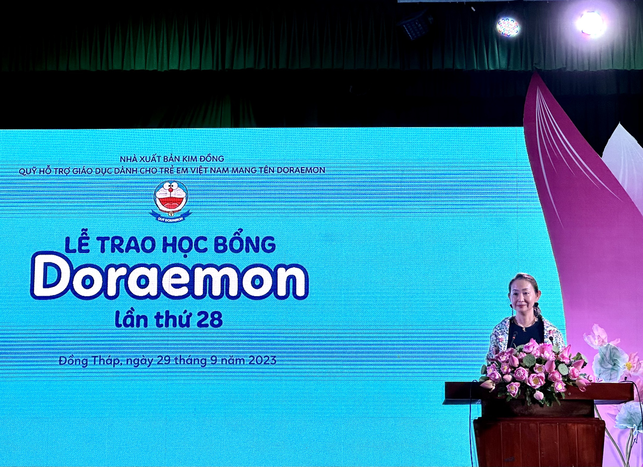 Ngày 29/9/2023, tại Trung tâm hoạt động Thanh thiếu nhi tỉnh Đồng Tháp, Nhà xuất bản Kim Đồng, Quỹ hỗ trợ giáo dục dành cho trẻ em Việt Nam mang tên Doraemon (Quỹ Doraemon) đã tổ chức lễ trao học bổng lần thứ 28 năm 2023 cho 559 em học sinh đến từ 20 tỉnh, thành phố khu vực Đông Nam Bộ và Đồng bằng sông Cửu Long. Mỗi suất học bổng Doraemon trị giá 1 triệu đồng.