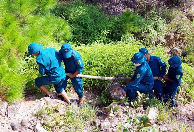 Lực lượng chức năng di chuyển một quả bom tới địa điểm để hủy nổ. Ảnh: Tá Chuyên/TTXVN |