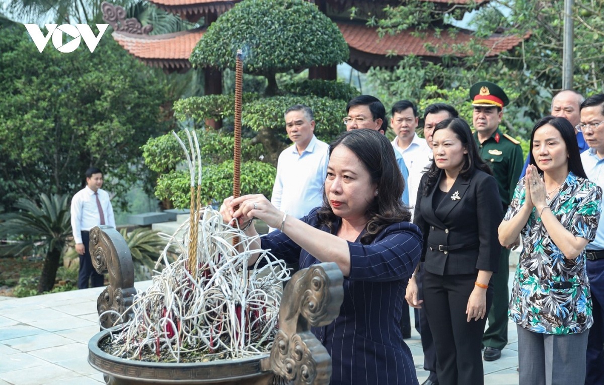 Quyền Chủ tịch nước Võ Thị Ánh Xuân dâng hương tưởng niệm Chủ tịch Hồ Chí Minh tại ATK Định Hóa. Ảnh: VOV |