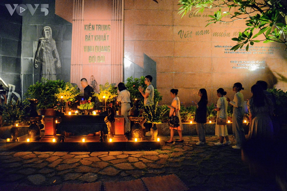 Khách tham quan dâng hương tại đài tưởng niệm trong di tích Nhà tù Hỏa Lò. - Ảnh: Đức Anh/VOV5 |