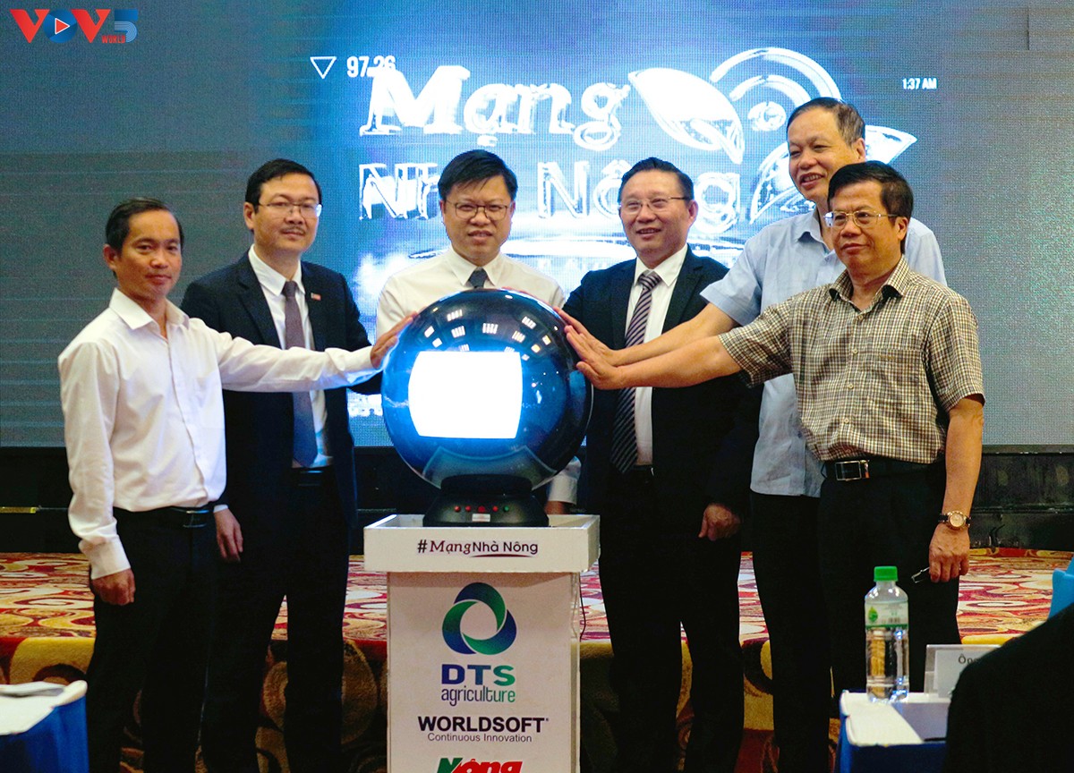 Các đại biểu nhấn nút ra mắt nền tảng “Mạng nhà nông”. Ảnh: Hồng Phương/VOV |