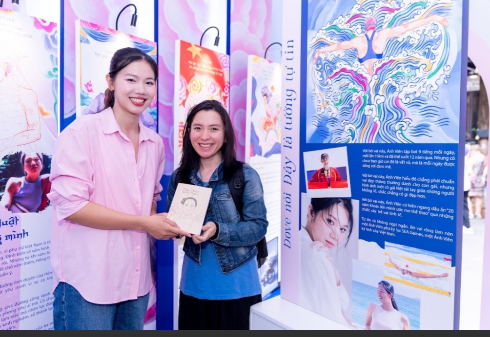 Nguyễn Thị Ánh Viên (người bên trái) tặng sách cho người tham dự sự kiện. Ảnh do Ban tổ chức cung cấp |