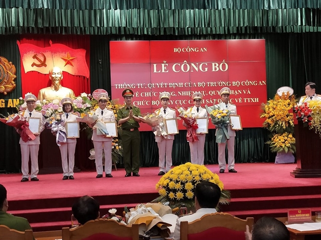 Thiếu tướng Nguyễn Duy Ngọc trao quyết định về chức năng, nhiệm vụ, quyền hạn và tổ chức bộ máy của Cục Cảnh sát Quản lý hành chính về trật tự xã hội - Ảnh: H.Trung/laodong.vn |