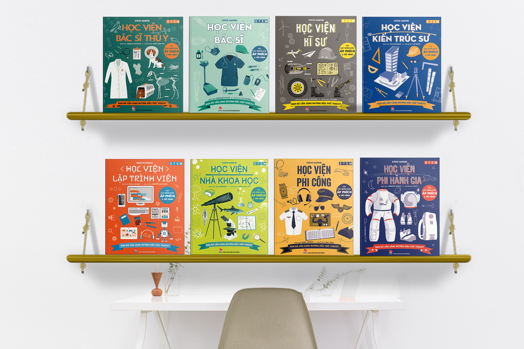 Bộ sách Học viện STEM gồm 8 cuốn, đề cập đến 8 lĩnh vực đang rất thịnh hành trong hệ thống Giáo dục STEM: Học Viện Lập Trình Viên, Học Viện Kĩ Sư, Học Viện Nhà Khoa Học, Học Viện Bác Sĩ, Học Viện Bác Sĩ Thú Y, Học Viện Phi Hành Gia, Học Viện Kiến Trúc Sư, Học Viện Phi Công.