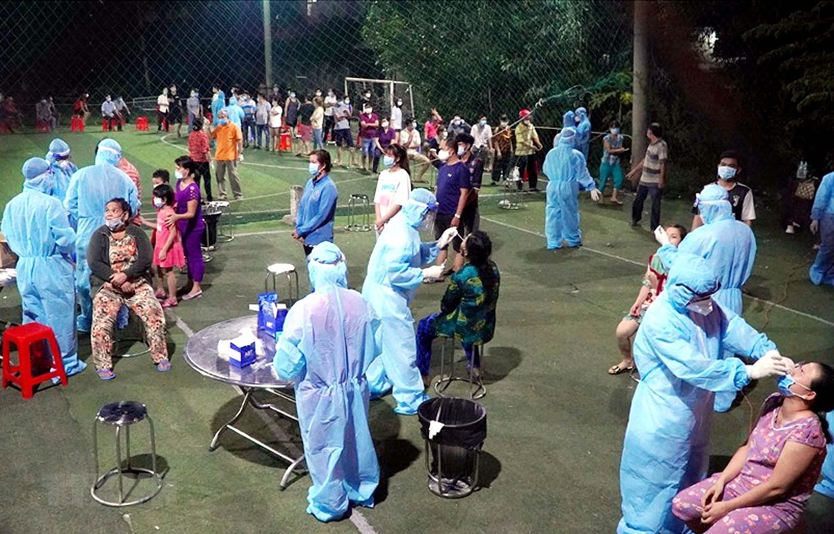 Các lực lượng chức năng lấy mẫu xét nghiệm tầm soát dịch COVID-19 ở phường An Lạc, quận Bình Tân. (Ảnh: TTXVN phát) |