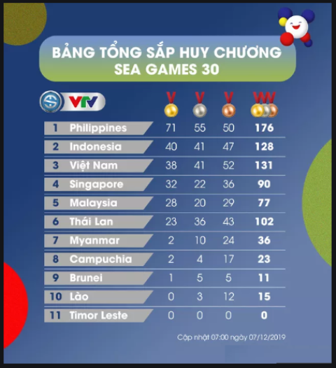 Tuy nhiên, trong bảng tổng sắp huy chương, Đoàn Việt Nam đã tụt xuống vị trí thứ 3. Đoàn chủ nhà Philippines vẫn duy trì vị trí số 1 với 71 HCV, thứ 2 là Indonesia với 40 HCV; Đoàn Việt Nam với 38 HCV xếp ở vị trí thứ 3. Tiếp theo là Singapore, Malaysia, Thái Lan, Myanmar, Campuchia, Brunei, Lào. Đoàn Timor Leste hiện vẫn chưa giành được huy chương.