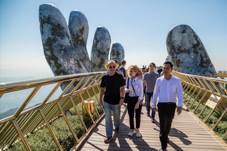 Trong chương trình tham quan, tìm hiểu hợp tác tại Đà Nẵng, tỷ phú người Anh Joe Lewis có những trải nghiệm thú vị ở Cầu Vàng thuộc Khu du lịch Sun World Ba Na Hills vào sáng ngày 15/5.
