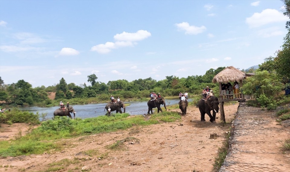 Một đoàn khách du lịch cưỡi voi vượt sông Sêrêpốk (đoạn qua địa phận Buôn Đôn, Đắk Lắk). - Ảnh: Minh Thuận/ laodong.vn |