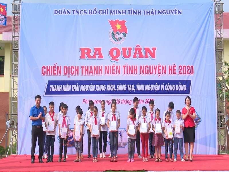 Tại lễ ra quân, Tỉnh đoàn Thái Nguyên và các đơn vị liên quan tặng quà cho các em học sinh có hoàn cảnh khó khăn - Ảnh: thainguyentv.vn |