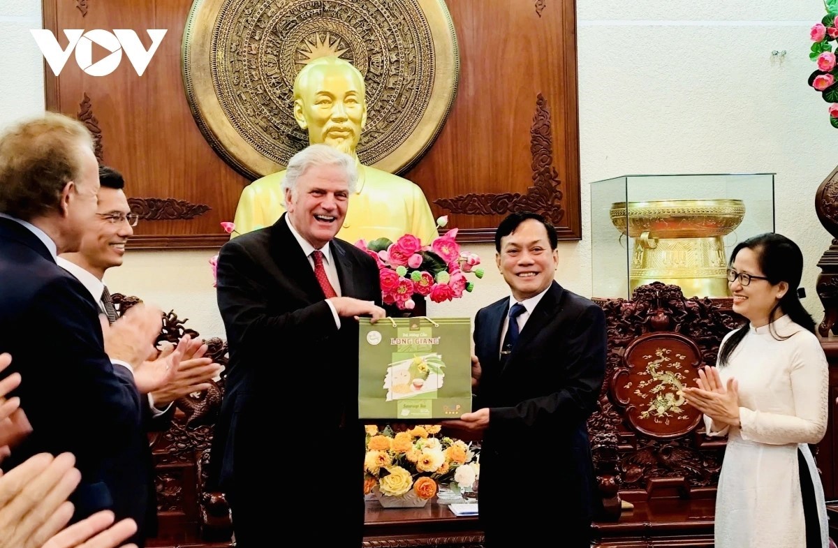 Ông Nguyễn Ngọc Hè - Phó Chủ tịch UBND TP. Cần Thơ tặng quà lưu niệm tại buổi gặp mặt đoàn nhân sự Tổ chức Truyền giáo Billy Graham. Ảnh: Hồng Phương/VOV |