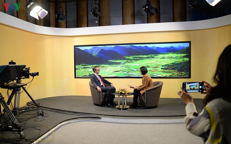 | Sau buổi gặp Tổng Giám đốc VOV, Đại sứ Aliberti đã trả lời phỏng vấn của kênh VOV1 về quan hệ Việt Nam-EU ngay tại studio Đài Tiếng nói Việt Nam. |