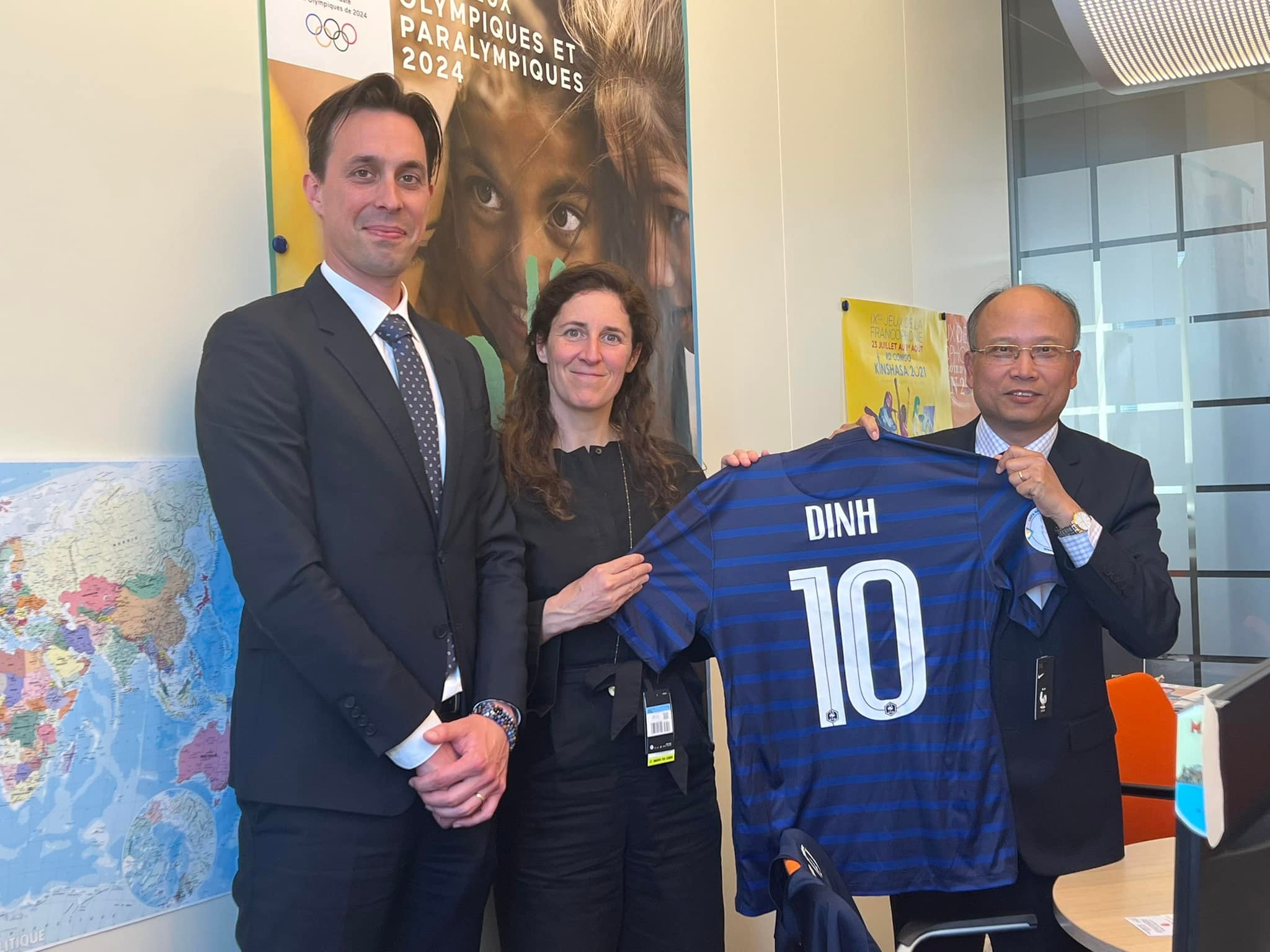 Ngày 02/6, Đại sứ Việt Nam tại Pháp Đinh Toàn Thắng đã có cuộc gặp bà Laurence Fischer, Đại sứ chuyên trách về Thể thao (Bộ ngoại giao Pháp) và đại diện Liên đoàn Bóng đá Pháp (FFF) để trao đổi về triển vọng hợp tác giữa hai nước trong lĩnh vực thể thao và các hoạt động hướng tới kỷ niệm 50 năm quan hệ ngoại giao và 10 năm Đối tác chiến lược trong năm 2023.