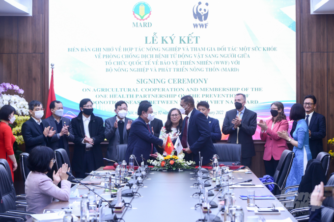 Bộ Bộ Nông nghiệp và Phát triển nông thôn và WWF ký kết Biên bản ghi nhớ “Tăng cường hợp tác phát triển nông nghiệp và đối tác Một sức khỏe về phòng chống dịch bệnh từ động vật sang người giai đoạn 2022 - 2026”. Ảnh: Tùng Đinh |