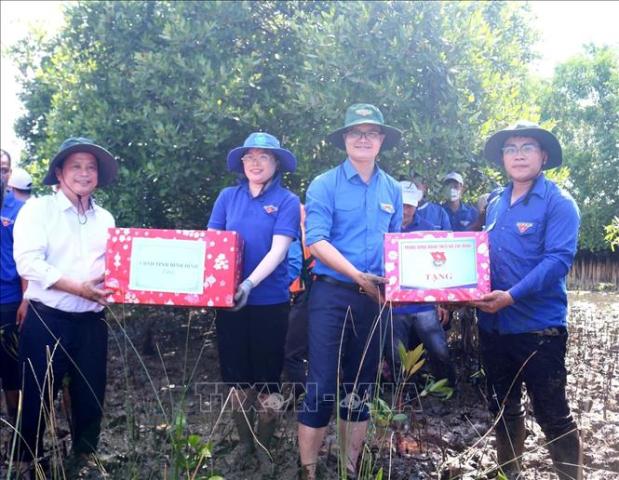 Bí thư thứ nhất Trung ương Đoàn Bùi Quang Huy (thứ 2 từ phải sang) cùng lãnh đạo tỉnh tặng quà cho các đội thanh niên tình nguyện tại huyện Tuy Phước. Ảnh: TTXVN |