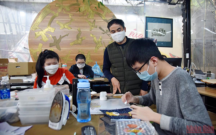 Các bạn trẻ khuyết tật làm việc tại xưởng Vụn Art, Hà Đông, Hà Nội. Ảnh: Minh Duy/ Báo Nhân dân |