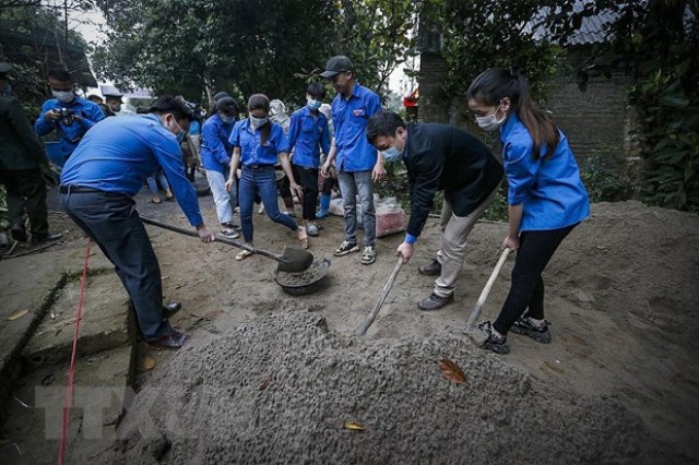 Đoàn viên, thanh niên tham gia cùng nhân dân làm mới bê tông hóa đường giao thông nông thôn tại xã Phong Phú, huyện Tân Lạc. Ảnh: Trọng Đạt/TTXVN |