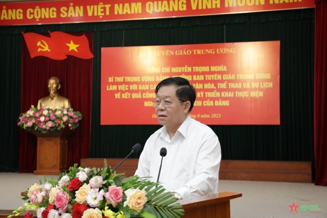 Tại buổi làm việc, ông Nguyễn Trọng Nghĩa nêu rõ lĩnh vực văn hóa, con người Việt Nam là một trong những lĩnh vực, nội dung được Đảng đặc biệt quan tâm, đặt ngang hàng với kinh tế, chính trị, xã hội. Ông Nguyễn Trọng Nghĩa đề nghị Ban cán sự đảng Bộ tiếp tục đẩy mạnh quán triệt, tuyên truyền sâu rộng các nghị quyết, chỉ thị, kết luận, văn bản của Đảng về phát triển văn hóa; tạo bước chuyển biến căn bản, toàn diện về nhận thức của đội ngũ cán bộ ngành văn hóa, lan tỏa trong hệ thống chính trị và toàn xã hội về vị trí, vai trò, mục tiêu, nhiệm vụ, giải pháp xây dựng và phát triển văn hóa, con người Việt Nam trong thời kỳ mới.