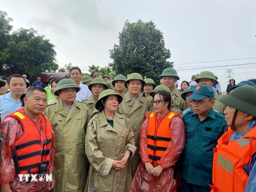 Bà Bùi Thị Minh Hoài, Bí thư Thành ủy Hà Nội (đứng giữa), trao đổi, động viên lực lượng xung kích phòng chống lũ tại huyện Quốc Oai. Ảnh: Nguyễn Văn Cảnh/TTXVN |