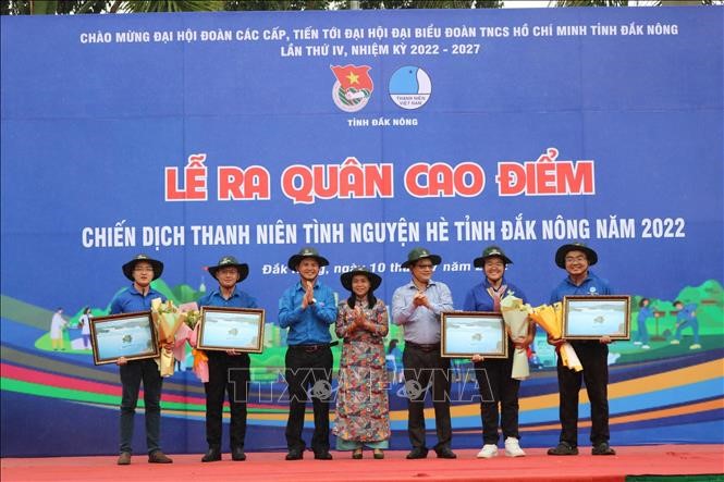 Ban Chỉ huy Chiến dịch thanh niên tình nguyện hè tỉnh Đắk Nông năm 2022 ra mắt nhận nhiệm vụ và tiếp nhận các nguồn lực từ các trường Đại học, Cao đẳng thành phố Hồ Chí Minh trao tặng. Ảnh: TTXVN |