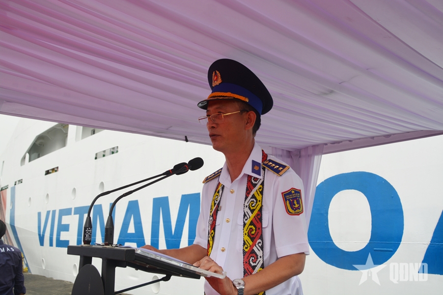 Đại tá Nguyễn Trần Đông, Phó tư lệnh Vùng Cảnh sát biển 3, Trưởng đoàn công tác Cảnh sát biển Việt Nam phát biểu tại lễ đón. Ảnh: qdnd.vn |