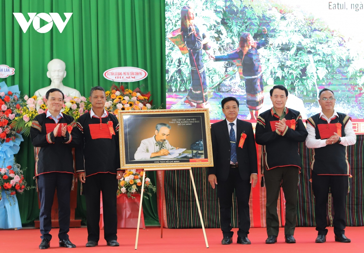 Phó Thủ tướng Chính phủ Trần Lưu Quang cùng đại diện lãnh đạo Bộ Công an tặng ảnh bác hồ cho Nhân dân xã Ea Tul. Ảnh: VOV |