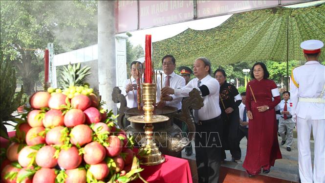 Phó Trưởng Ban tuyên giáo Trung ương Võ Văn Phuông (bên phải) và Bí thư Tỉnh ủy Tây Ninh Phạm Viết Thanh cùng các đại biểu dâng hương tưởng niệm các liệt sĩ - Ảnh: TTXVN |