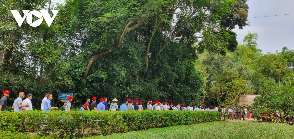 Trong những dòng người về quê Chủ tịch Hồ Chí Minh dịp này có nhiều đoàn thanh thiếu nhi, học sinh về báo công dâng Người. Ảnh: VOV |