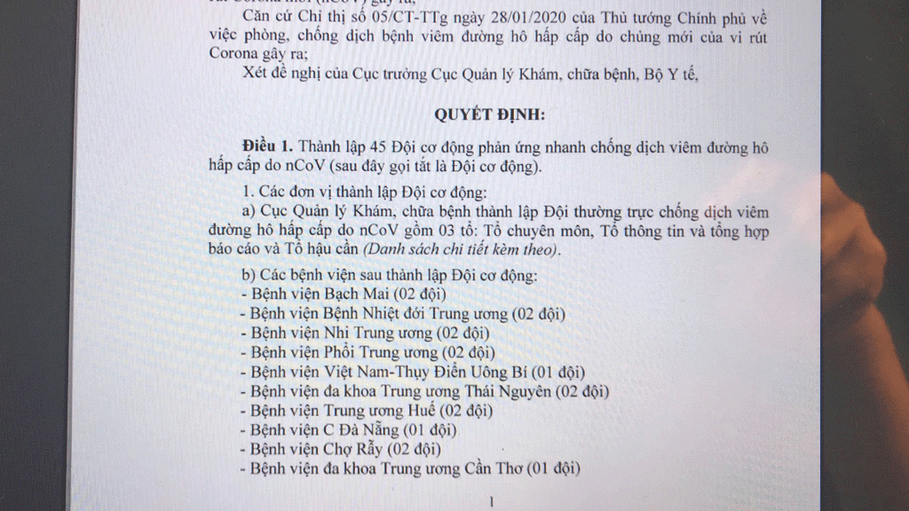 Chiều 30/1, Phó Giáo sư, Tiến sĩ Lương Ngọc Khuê, Cục trưởng Cục Quản lý Khám, chữa bệnh (Bộ Y tế) cho biết, thực hiện Chỉ thị của Thủ tướng Chính phủ về việc phòng, chống dịch bệnh viêm đường hô hấp cấp do chủng mới của vi rút Corona (nCoV) gây ra, Bộ Y tế đã thành lập 45 đội cơ động phản ứng nhanh chống dịch viêm đường hô hấp cấp do nCoV (gọi tắt là Đội cơ động).