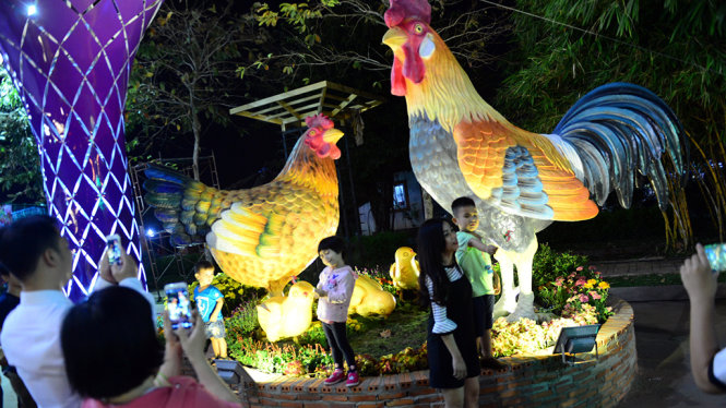 | Cặp gà trống mái tại chợ hoa xuân Bình Điền 2017 (Ảnh: tuoitre.vn) |