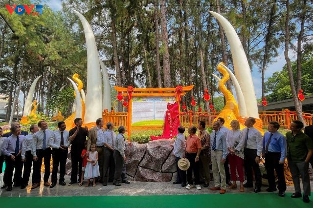 Các đại biểu thực hiện nghi thức khánh thành Vườn thông Hữu nghị. Ảnh: Tỷ Huỳnh/VOV |
