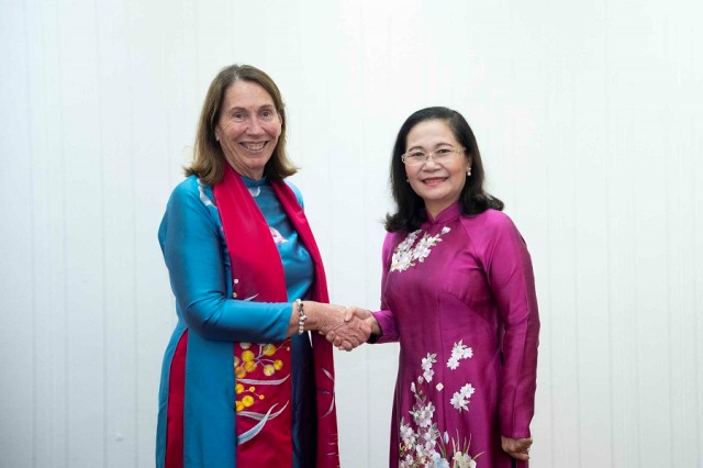 Phó Bí thư Thành uỷ, Chủ tịch Hội đồng nhân dân TP. Hồ Chí Minh, Nguyễn Thị Lệ, chào mừng Chủ tịch Thượng viện Australia Sue Lines. Ảnh: quochoi.vn |