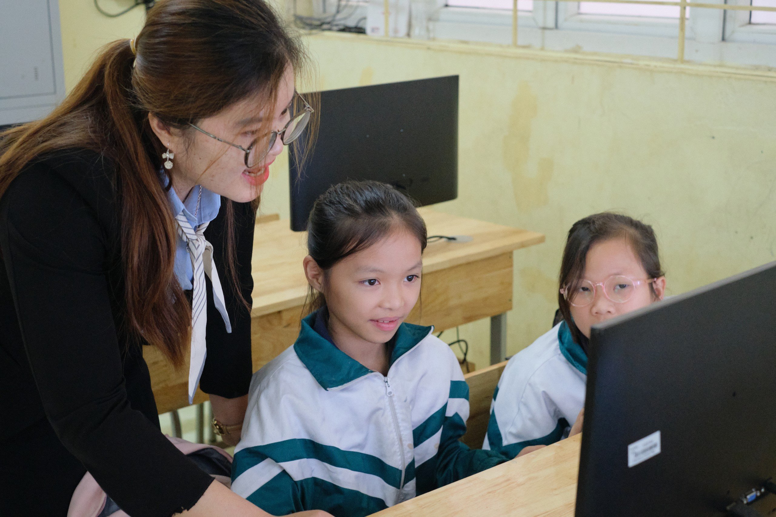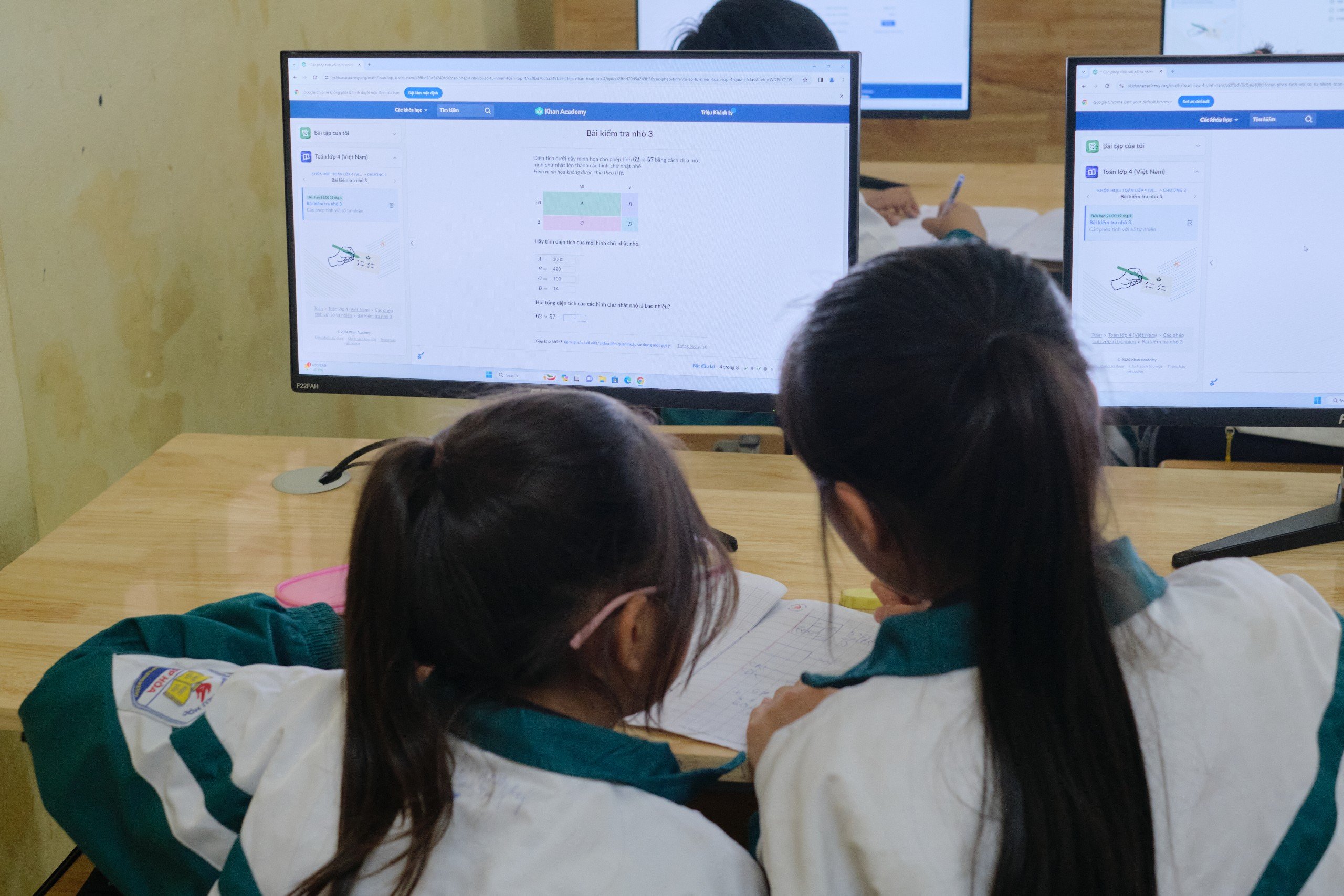 Các em rất hào hứng với phương pháp học trên nền tảng Khan Academy. Ảnh Mai Huệ |