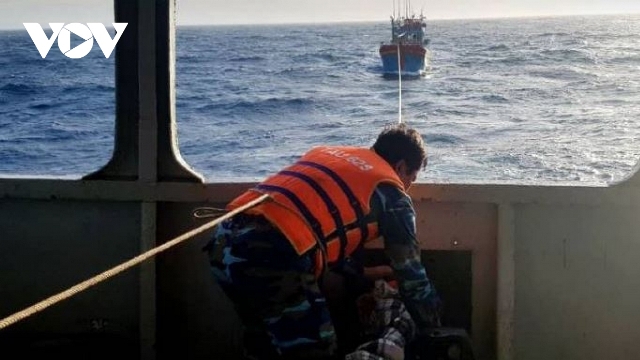 Cán bộ, chiến sĩ Vùng 3 Hải quân lai dắt tàu cá của ngư dân bị nạn trên biển vào bờ. ảnh: VOV |
