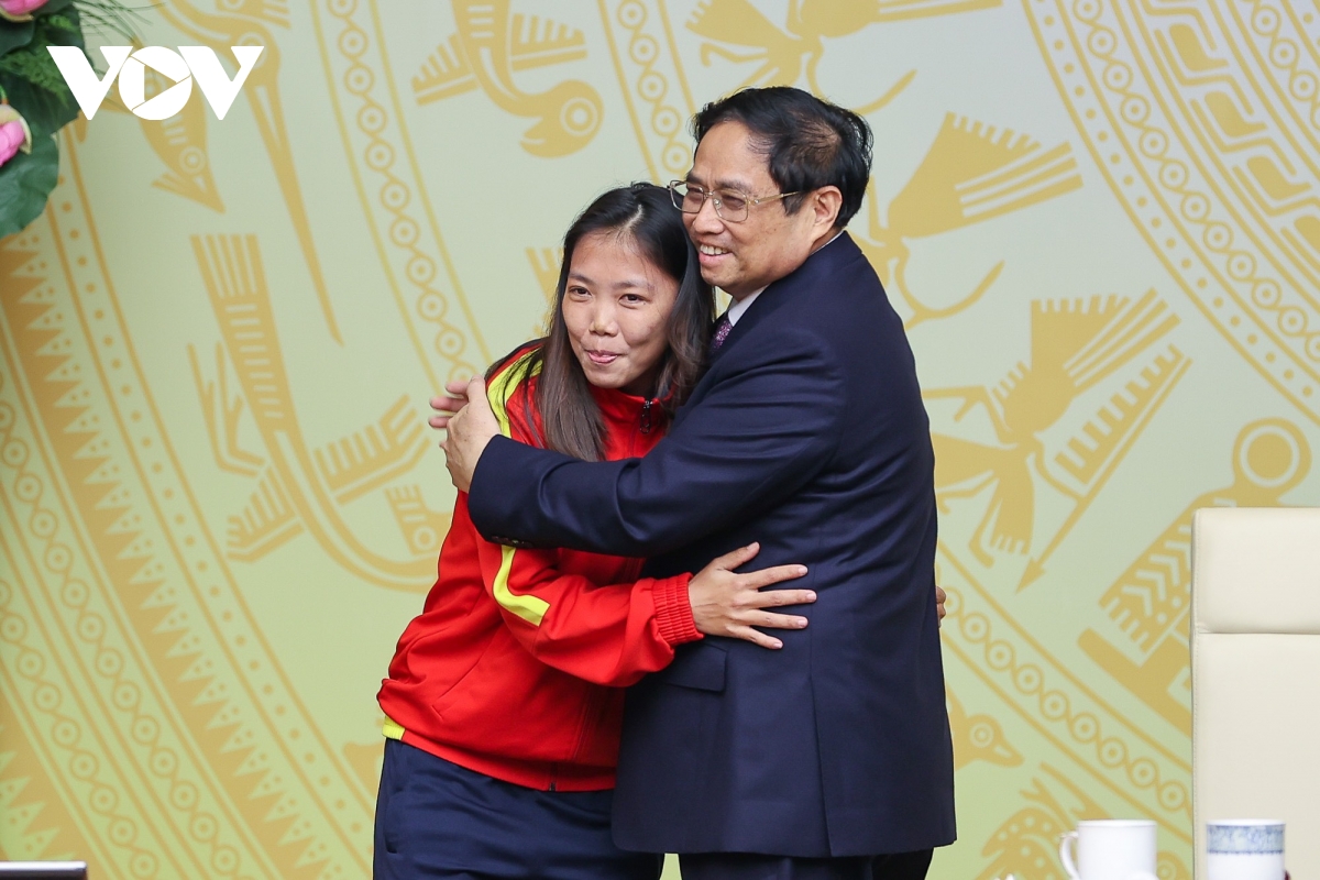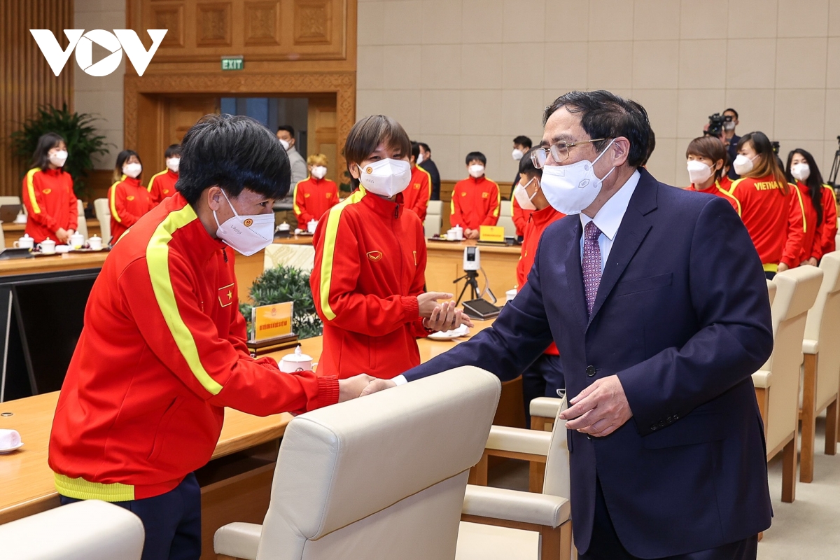 Thủ tướng nhấn mạnh, những ngày đầu của Xuân Nhâm dần, chiến thắng của đội tuyển bóng đá nam và nữ được ví như món quà lì xì may mắn đầu năm mới, lan tỏa năng lượng tích cực đến người hâm mộ cả nước: “Thay mặt lãnh đạo Đảng và Nhà nước, tôi chân thành cảm ơn và xin gửi lời chúc mừng nồng nhiệt nhất, xin nhiệt liệt biểu dương toàn thể Đội tuyển bóng đá nữ quốc gia dưới sự dẫn dắt của Huấn luyện viên Mai Đức Chung và Ban Huấn luyện. Có mặt ở đây hôm nay, không chỉ đội bóng mà còn có nhiều cơ quan, bộ, ngành, nhiều doanh nghiệp, nên tôi muốn chúng ta quan sát thực tế, thấu hiểu, chia sẻ, lắng nghe về những khó khăn, vất vả của bóng đá nữ để có những giải pháp trước mắt, lâu dài đối với sự phát triển của bóng đá nữ nói riêng và các môn thể thao thi đấu không phải là môn thể thao đỉnh cao nói chung. Chúng ta cần có giải pháp để sau khi lá cờ Tổ quốc được kéo lên để tôn vinh những tập thể và cá nhân xuất sắc thì cuộc sống của những vận động viên được đảm bảo, nhất là sau khi giải nghệ.”