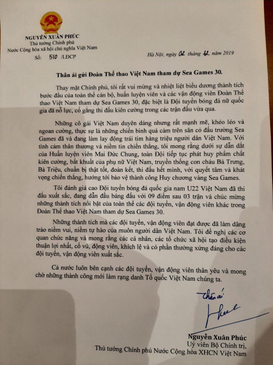 Tối 2/12, Thủ tướng Chính phủ Nguyễn Xuân Phúc gửi thư chúc mừng và động viên tới Huấn luyện viên trưởng Đội tuyển bóng đá nam Việt Nam, ông Park Hang-seo, cùng toàn thể Đoàn Thể thao Việt Nam đang tham dự Đại hội Thể thao Đông Nam Á 2019, SEA Games 30.