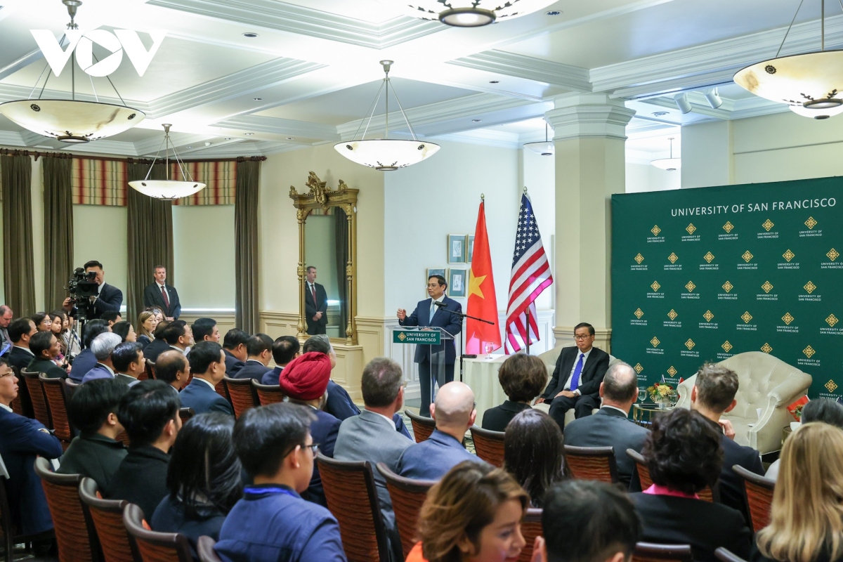 Phát biểu tại đây, Thủ tướng Phạm Minh Chính nhấn mạnh Việt Nam xác định giáo dục là quốc sách hàng đầu với chủ trương thúc đẩy học tập suốt đời; đào tạo nhân lực chất lượng cao là một trong ba đột phá chiến lược… Việt Nam luôn mong muốn tìm kiếm, mở rộng các cơ hội hợp tác phát triển với các cơ sở giáo dục, đào tạo của Hoa Kỳ, trong đó có Đại học San Francisco. Thủ tướng đề nghị Đại học USF đi đầu trong xu thế hợp tác giữa hai nước về giáo dục đào tạo, xác định Việt Nam là một trọng điểm hợp tác, cung cấp nhiều hơn nữa học bổng cho sinh viên Việt Nam, tập trung vào các lĩnh vực mới, như; đổi mới sáng tạo, chuyển đổi số, chuyển đổi xanh, kinh tế tuần hoàn, kinh tế chia sẻ…. Thủ tướng nhấn mạnh việc đẩy mạnh hợp tác giáo dục vừa phù hợp với ưu tiên của Việt Nam, vừa phù hợp xu thế thời đại, vừa phù hợp với định hướng hợp tác của Hoa Kỳ với Việt Nam.