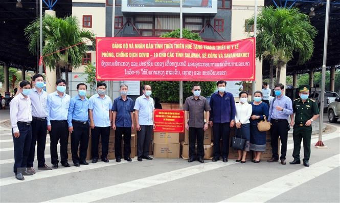 Đoàn công tác của tỉnh Thừa Thiên- Huế trao tặng trang thiết bị y tế phòng, chống dịch COVID-19 cho tỉnh Savannakhet (Lào) - Ảnh: TTXVN |