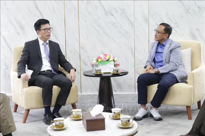 Phó trưởng Ban Tôn giáo Chính phủ Nguyễn Tiến Trọng và Giám đốc Cơ quan Đảm bảo Sản phẩm Halal (BPJPH) Muhammad Aqil Irham cùng thảo luận các biện pháp thúc đẩy hợp tác tôn giáo giữa Việt Nam và Indonesia. Ảnh: TTXVN |