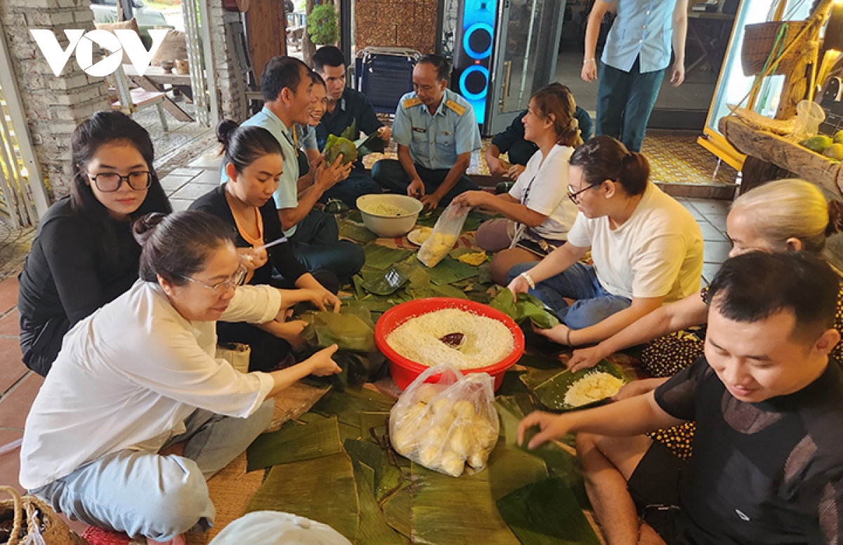 Các sĩ quan quân đội và nhiều bạn trẻ, cụ già tham gia gói bánh |
