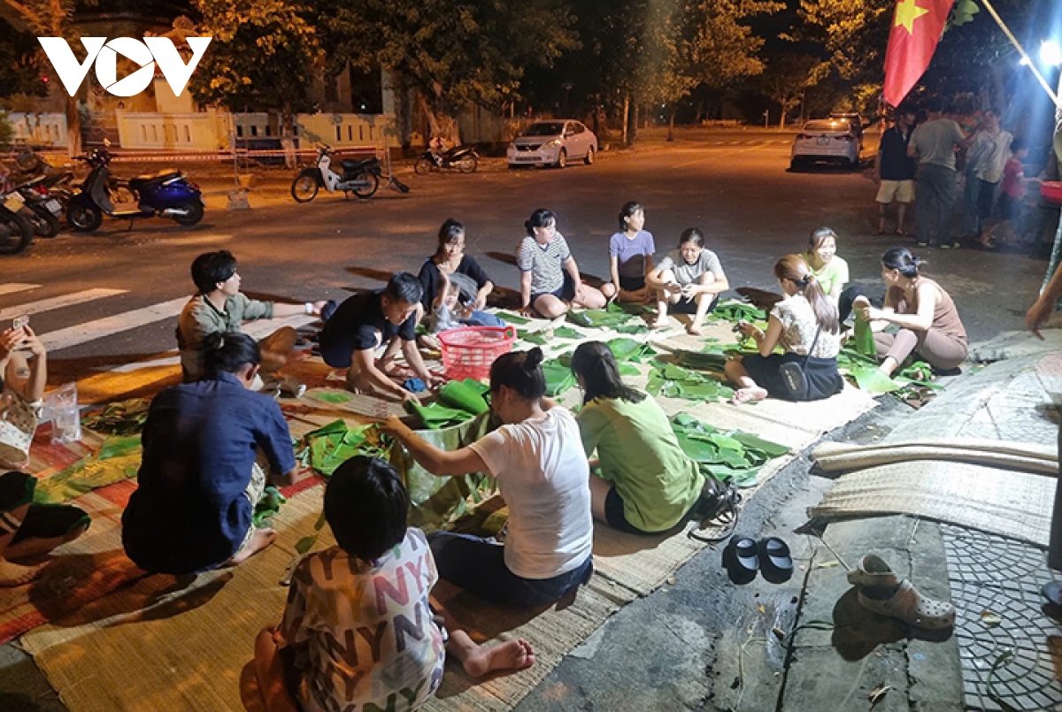 Những ngày qua, hình ảnh người dân các tỉnh phía Bắc dầm mình trong nước lũ, sạt lở đất vùi lấp nhiều người khiến ai cũng nhói lòng. Từng nếm trải cảnh mất mát do lụt bão và nhận được ân tình của nhân dân cả nước, bà con miền Trung tự nguyện gói bánh, quyên góp lương thực, thực phẩm, phao cứu sinh gửi ra miền Bắc hỗ trợ người dân vùng thiên tai. Tại thành phố Đà Nẵng, bà con nhiều khu dân cư thức trắng đêm để gói từng chiếc bánh chưng, bánh tét gửi ra giúp bà con vùng lũ.