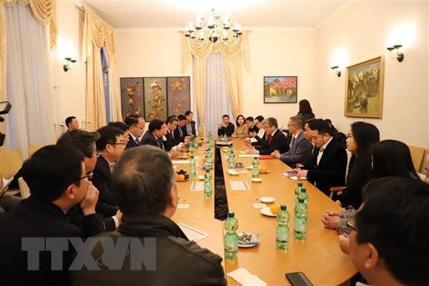 Bộ trưởng Nguyễn Chí Dũng thảo luận với đại diện Mạng lưới đổi mới sáng tạo Việt Nam tại Đức. Ảnh: PHương Hoa/TTXVN |