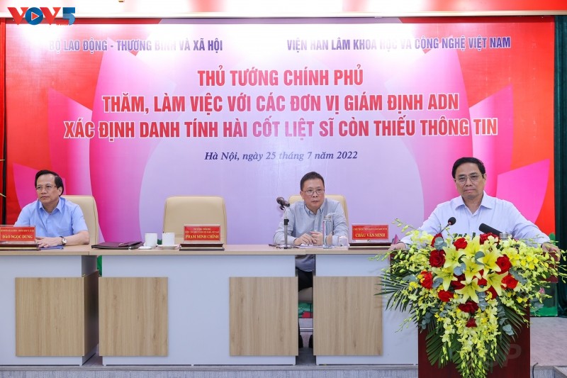 Chiều 25/07, tại Hà Nội, Thủ tướng Phạm Minh Chính làm việc với các đơn vị giám định ADN hài cốt liệt sĩ còn thiếu thông tin gồm Viện pháp y quân đội, Bộ Quốc phòng; Viện pháp y quốc gia, Bộ Y tế và Viện Công nghệ sinh học, Viện Hàn lâm Khoa học và Công nghệ Việt Nam.