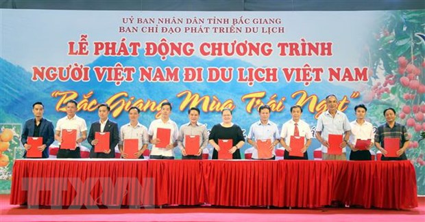 Các doanh nghiệp, cơ sở kinh doanh dịch vụ du lịch tại Bắc Giang ký kết chương trình kích cầu du lịch - Ảnh: TTXVN |