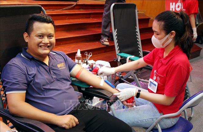Tình nguyện viên tham gia hiến máu tại chương trình. Ảnh: TTXVN |