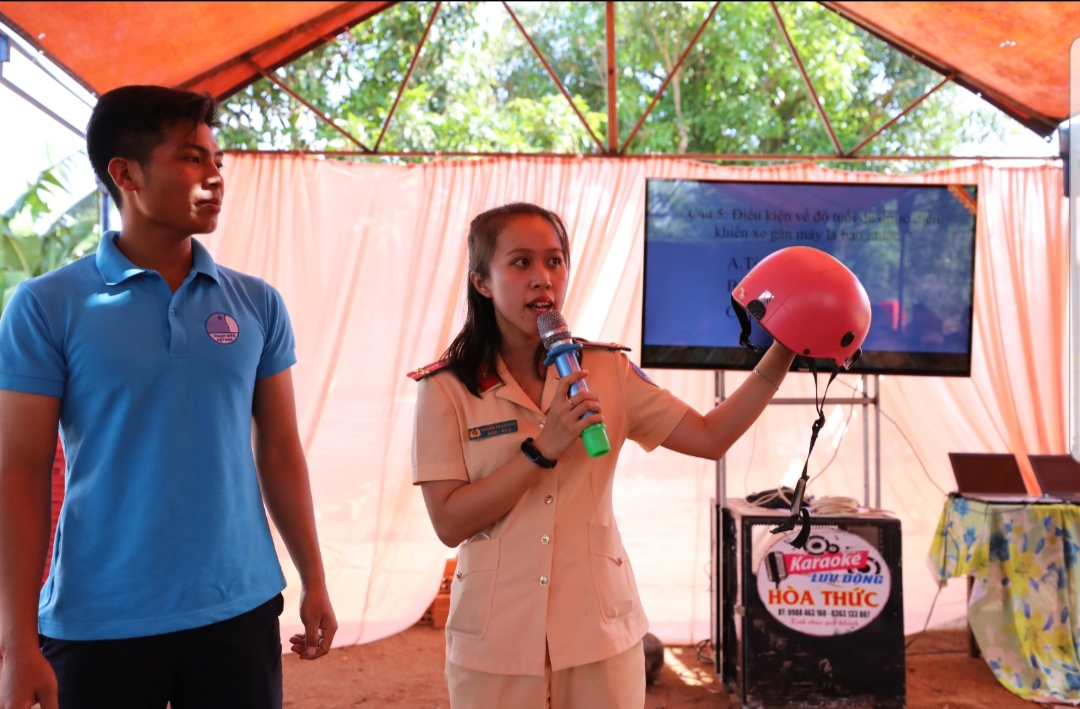 Công an tuyên truyền đội mũ bảo hiểm cho người dân. |