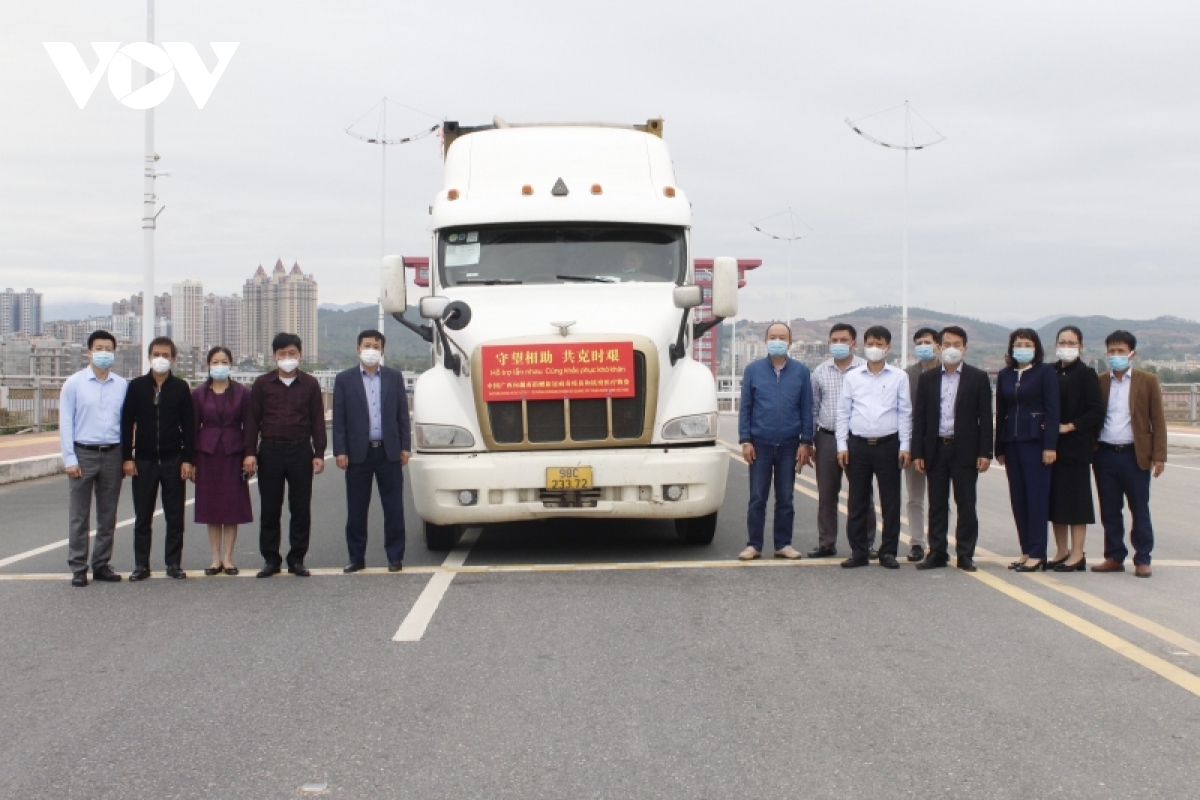 Bộ Y tế, Sở Ngoại vụ, Sở Y tế và TP Móng Cái tiếp nhận vật tư y tế và vaccine phòng Covid-19 do Chính quyền Khu tự trị dân tộc Choang, Quảng Tây, Trung Quốc bàn giao. ảnh: VOV |