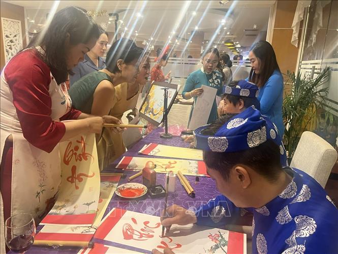 Trình diễn văn hóa viết thư pháp tại hoạt động - Ảnh: TTXVN |