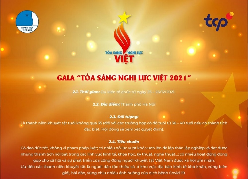 Diễn ra từ tháng 10 đến tháng 12/2021, Chương trình “Tỏa sáng nghị lực Việt” năm 2021 do Trung ương Hội Liên hiệp Thanh niên Việt Nam tổ chức, nhằm tìm kiếm và tôn vinh các tấm gương thanh niên khuyết tật tiêu biểu, giàu nghị lực, vượt qua nghịch cảnh và tích cực đóng góp cho sự phát triển của cộng đồng.
