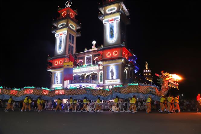 Lễ rước Đức Phật Mẫu và Cửu vị Tiên Nương, múa Long – Lân – Qui – Phụng tại đền thánh Cao đài Tây Ninh - Ảnh: TTXVN |