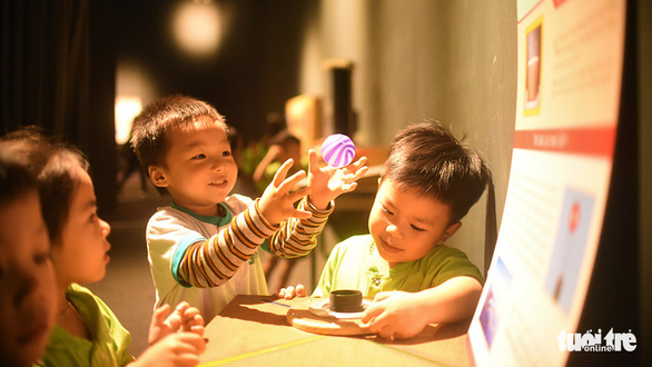 Một nhóm các em nhỏ thích thú với mô hình quả bóng biết bay-Ảnh tuoitre.vn |